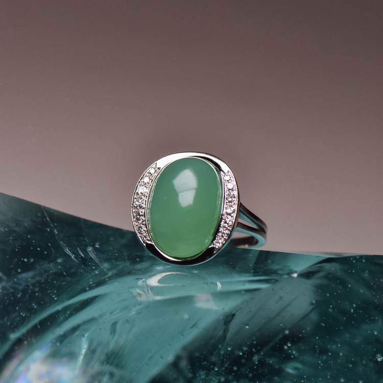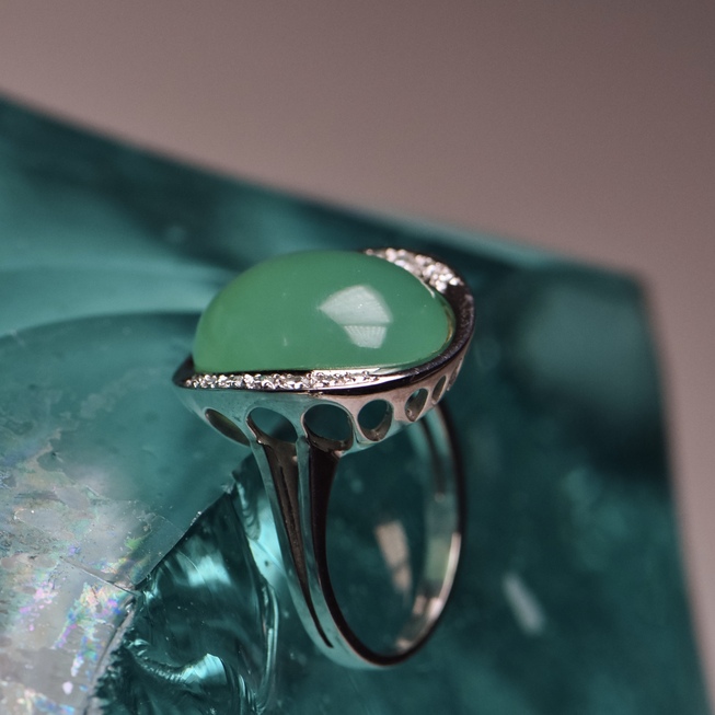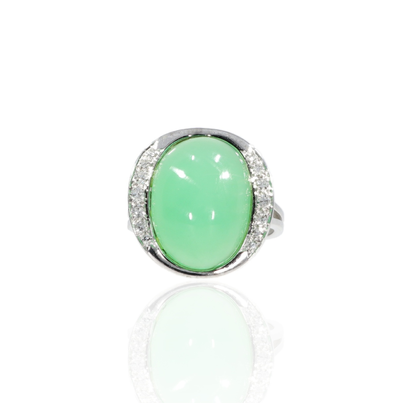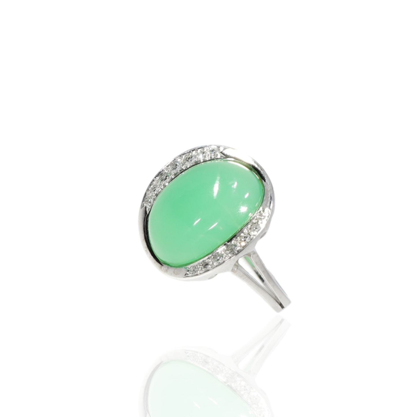 Chrysopras in seinem charakteristischen Apfelgrün, gefasst in Weissgold und seitlich von Diamanten begleitet. Die schlichte Fassung gibt dem Stein den Raum, den er verdient.
