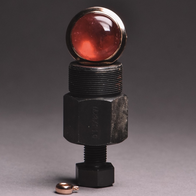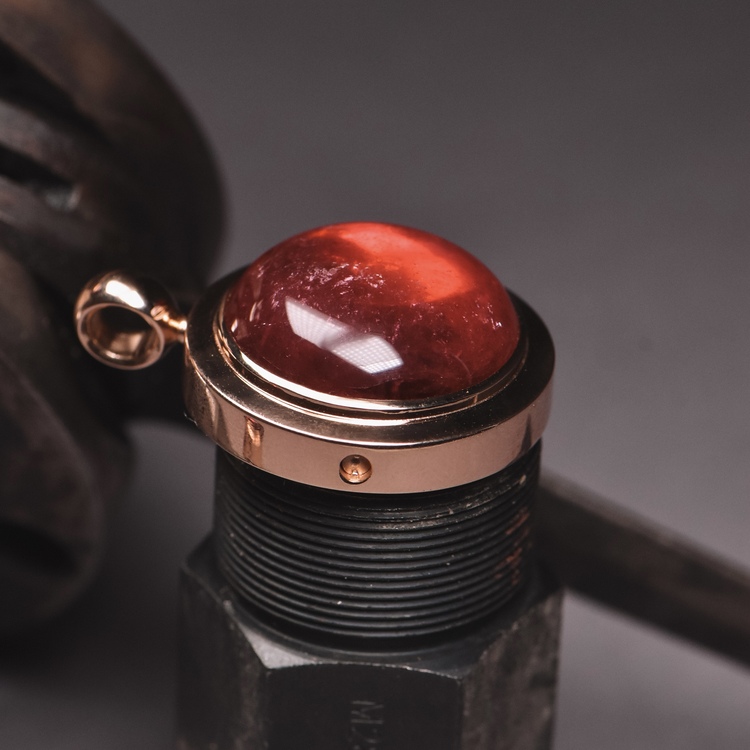 Ein grossformatiger Rubellit Cabochon mit tiefer Rosafarbe ist in eine massive Rotgoldfassung integriert. Die klare Kreisform und die abnehmbare Öse verleihen diesem Occasion Schmuckstück eine wandelbare Funktion zwischen Anhänger und Verschluss.