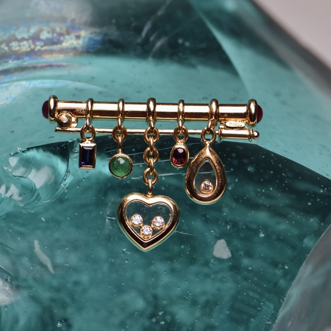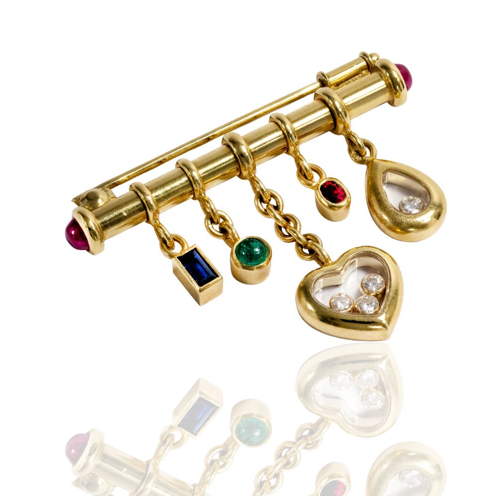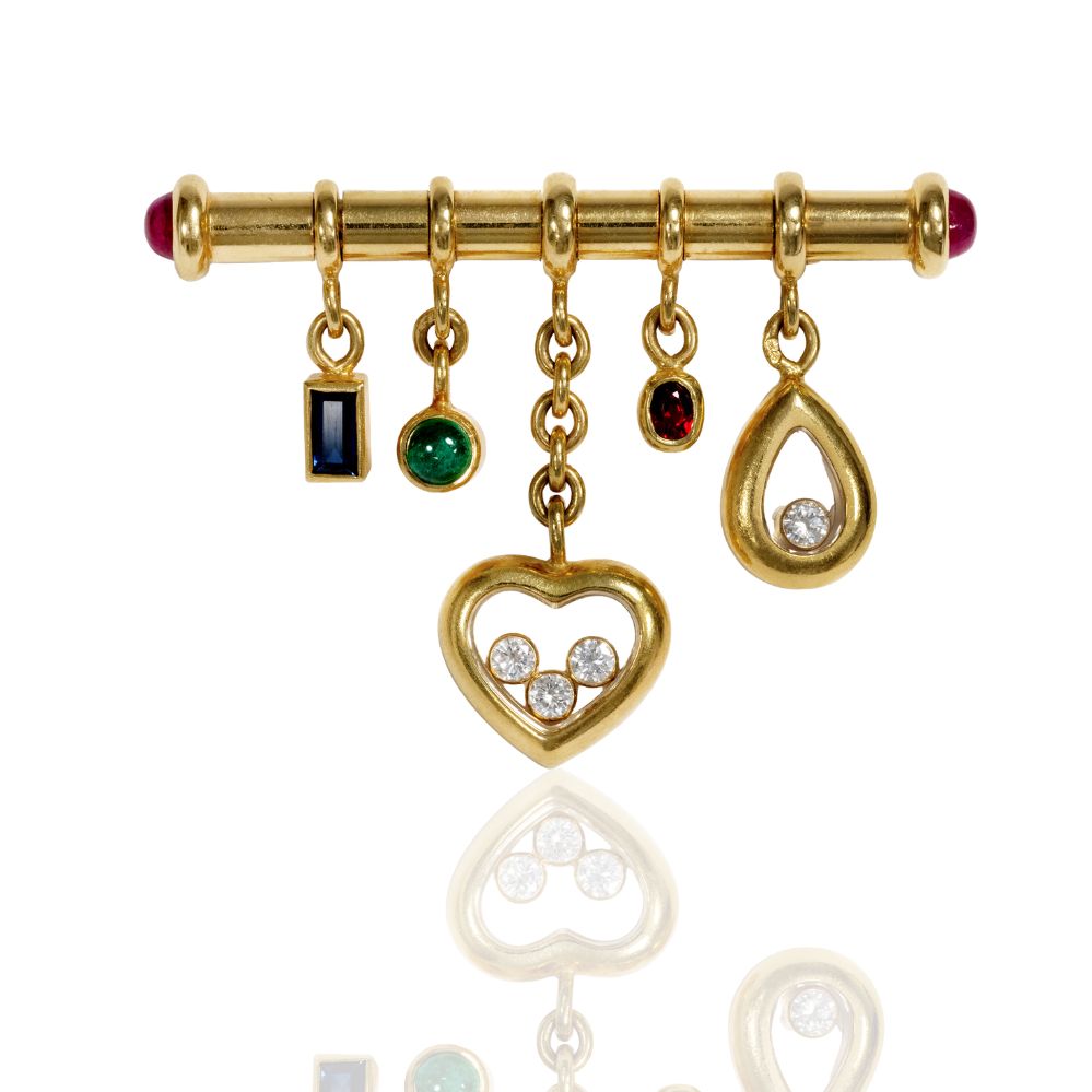 Fünf bewegliche Anhänger in Herz- und Tropfenform, besetzt mit farbigen Edelsteinen und frei schwebenden Brillanten – eine Stabbrosche aus Chopards ikonischer «Happy Diamonds»-Linie in Gelbgold.