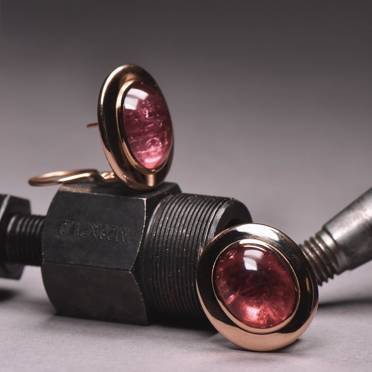 Zwei grossformatige Rubellit Cabochons mit intensiver Rosanuance sind in Rotgoldfassungen eingesetzt. Die ovale Form und das Volumen verleihen diesen Occasion Ohrclips eine prägnante Wirkung.