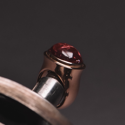 Ein grossformatiger Rubellit Cabochon in tiefem Rosaton sitzt in einer kraftvollen Rotgoldfassung. Das Design betont die Farbintensität dieses leuchtenden Edelsteins.
