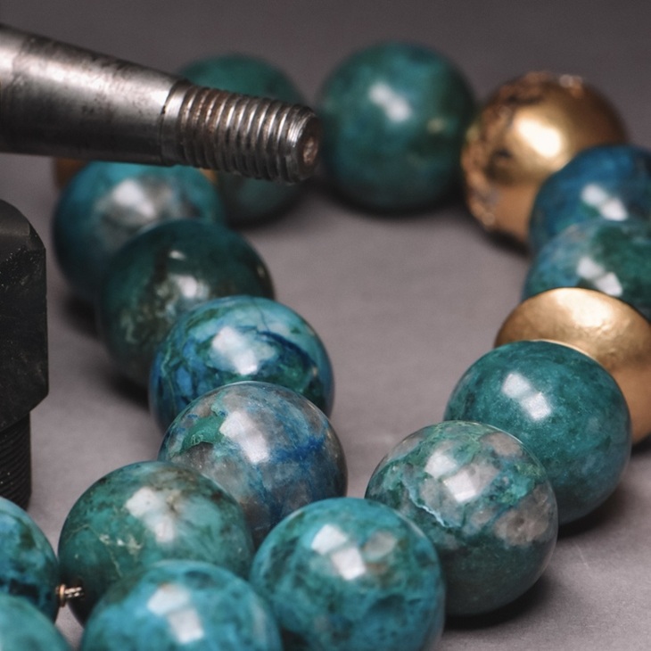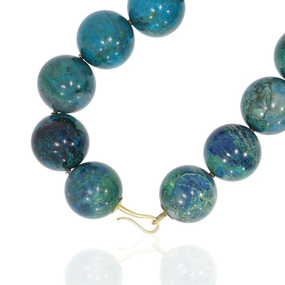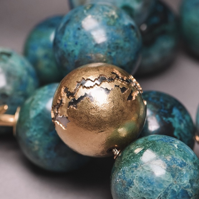 Grossformatige Chrysokoll Kugeln mit lebendigem Blau Grün Farbspiel prägen dieses ausdrucksstarke Steincollier. Goldene Zwischenelemente setzen Akzente und unterstreichen den Charakter dieses Occasion Schmuckstücks.