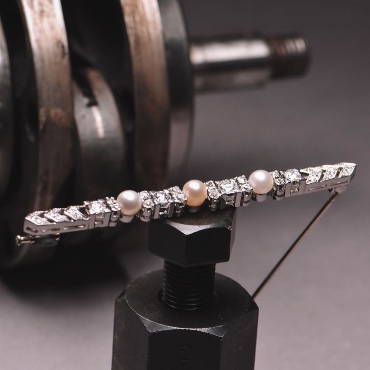 Fein proportionierte Akoya Kulturperlen gliedern diese elegante Stabbrosche aus Platin mit klarer Linienführung. Unterschiedliche Diamantschliffe verleihen dem Schmuckstück Tiefe und eine lebendige Lichtwirkung.