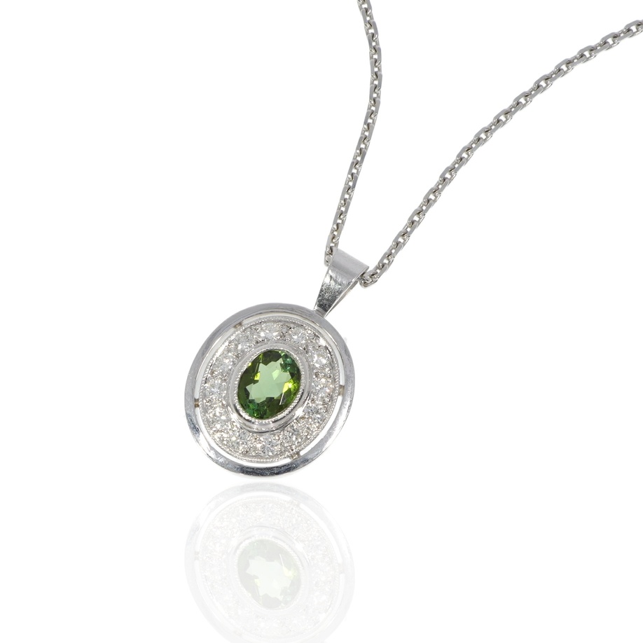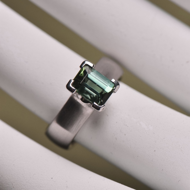 Kraftvoller Ring aus 750 Weissgold mit einem rechteckig facettierten grünen Turmalin im Mittelpunkt. Die Zargenform der Fassung am Rande und die moderne Ringschiene unterstreichen die intensive Wirkung des 1,71 ct schweren Edelsteins.