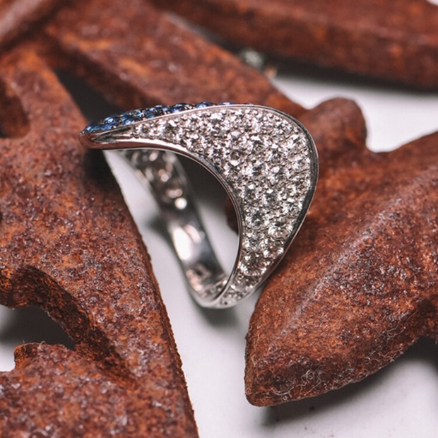 Ein geschwungener Weissgoldring mit spannender Linienführung, pavé gefasst mit Saphiren und Diamanten. Die asymmetrische Bewegung verleiht diesem Occasion Schmuckstück eine dynamische Präsenz.