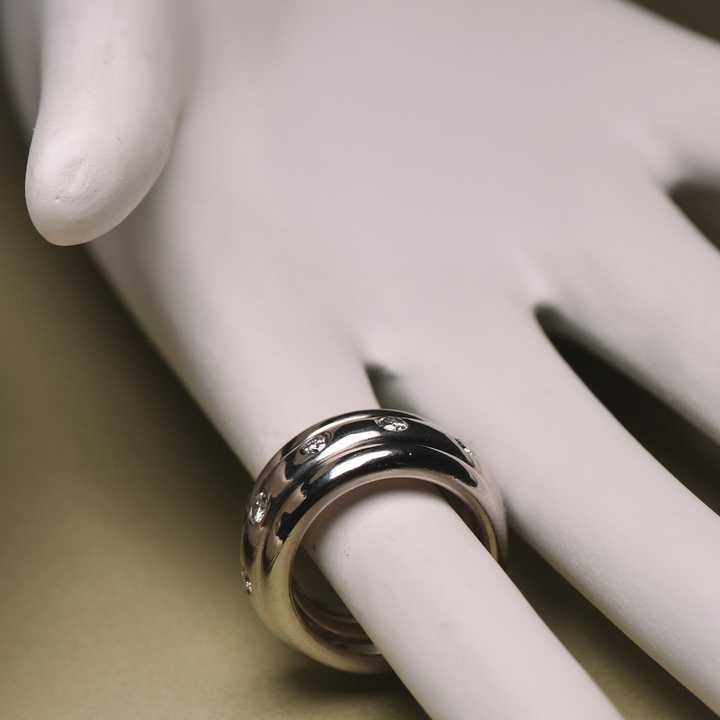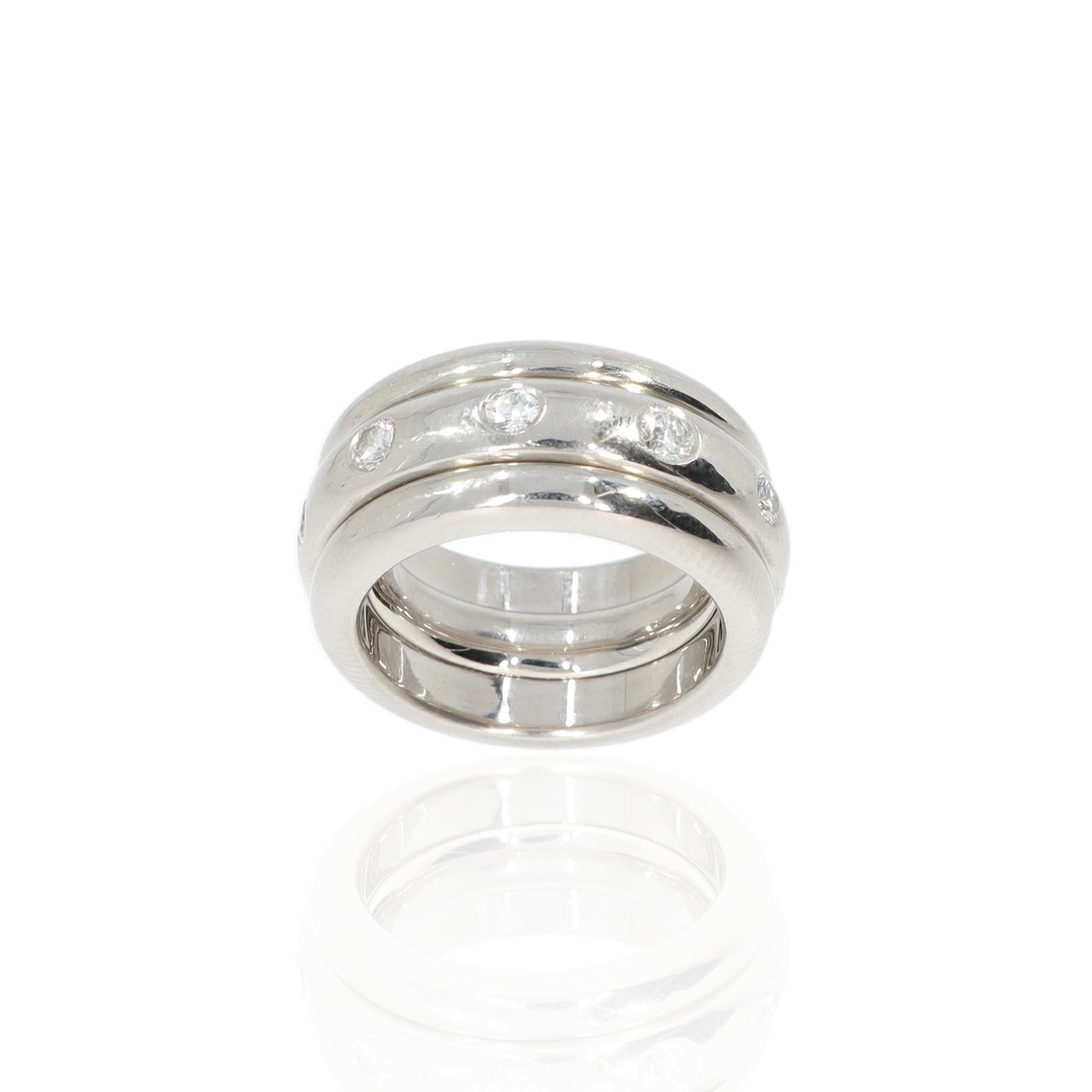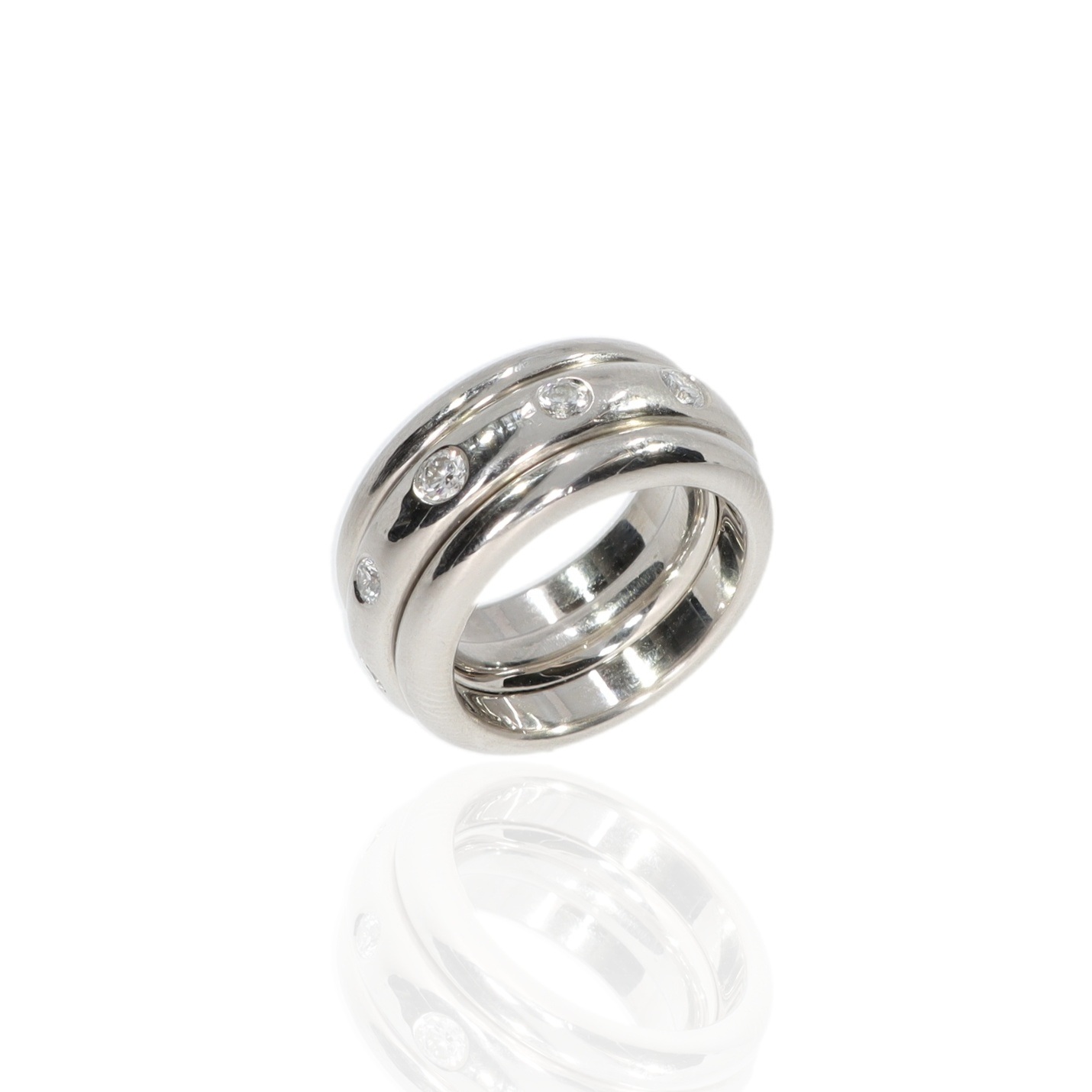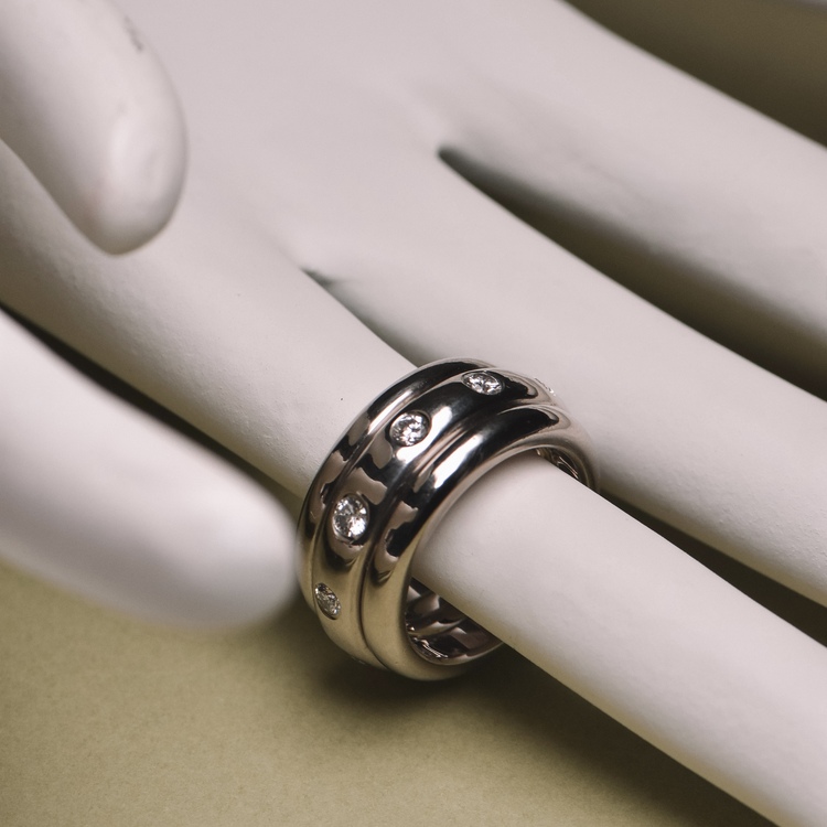 Massiver Ring aus Palladium mit rundum gefassten Brillanten auf beweglichem Mittelring. Die klare Bandform und die integrierten Steine prägen das Design.